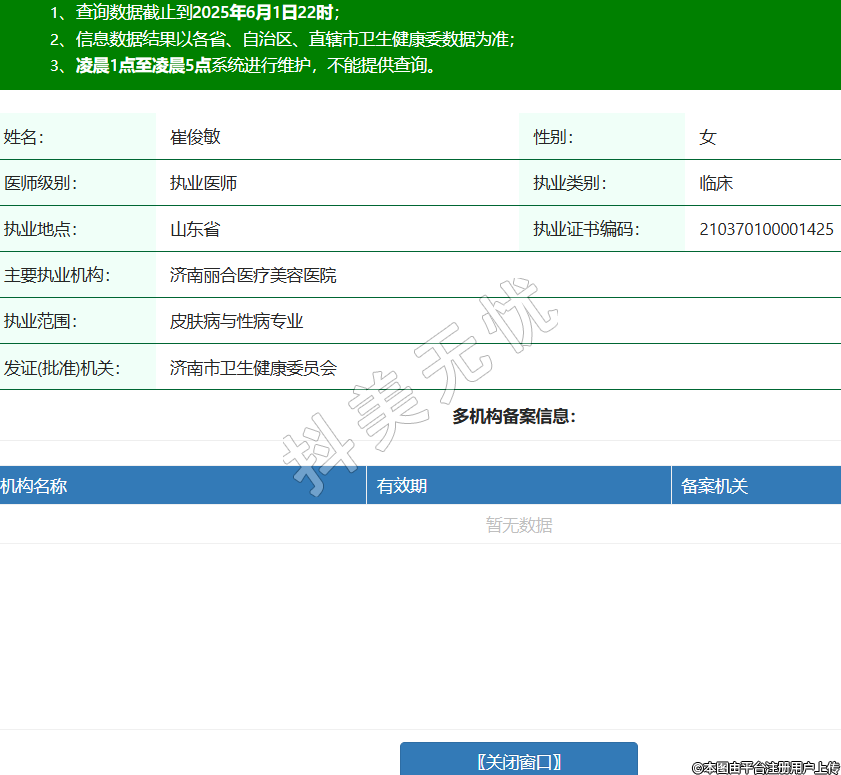 姓名:崔俊敏性別:女醫(yī)師級別:執(zhí)業(yè)醫(yī)師執(zhí)業(yè)類別:臨床執(zhí)業(yè)地點:山東省執(zhí)業(yè)證書編碼:210370100001425主要執(zhí)業(yè)機構:濟南麗合醫(yī)療美容醫(yī)院執(zhí)業(yè)范圍:皮膚病與性病專業(yè)發(fā)證(批準)機關:濟南市衛(wèi)生健康委員會
