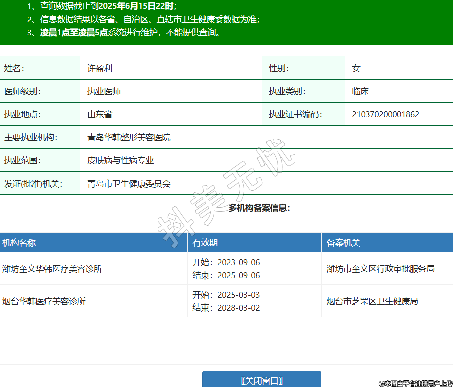 機(jī)構(gòu)名稱 有效期 備案機(jī)關(guān) 濰坊奎文華韓醫(yī)療美容診所 開始:2023-09-06結(jié)束:2025-09-06濰坊市奎文區(qū)行政審批服務(wù)局 煙臺(tái)華韓醫(yī)療美容診所 開始:2025-03-03結(jié)束:2028-03-02煙臺(tái)市芝罘區(qū)衛(wèi)生健康局 -
