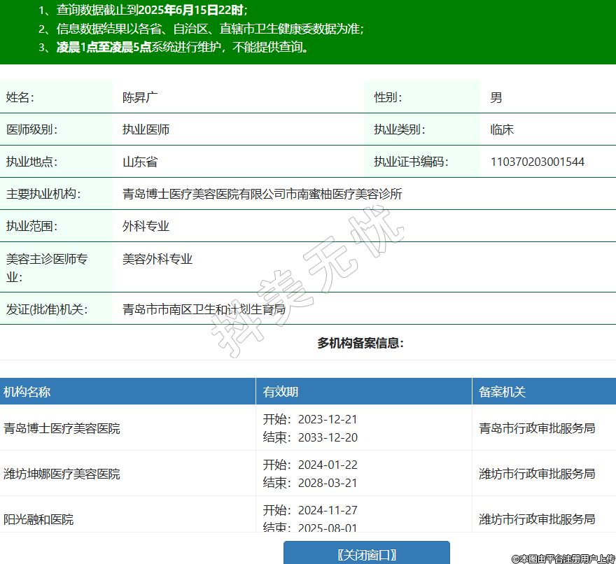機構(gòu)名稱 有效期 備案機關(guān) 青島博士醫(yī)療美容醫(yī)院 開始:2023-12-21結(jié)束:2033-12-20青島市行政審批服務(wù)局 濰坊坤娜醫(yī)療美容醫(yī)院 開始:2024-01-22結(jié)束:2028-03-21濰坊市行政審批服務(wù)局 陽光融和醫(yī)院 開始:2024-11-27結(jié)束:2025-08-01濰坊市行政審批服務(wù)局 -