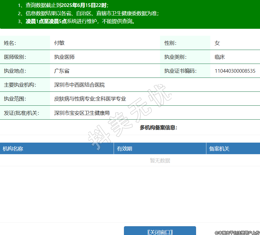姓名:付敏性別:女醫(yī)師級別:執(zhí)業(yè)醫(yī)師執(zhí)業(yè)類別:臨床執(zhí)業(yè)地點:廣東省執(zhí)業(yè)證書編碼:110440300008535主要執(zhí)業(yè)機構(gòu):深圳市中西醫(yī)結(jié)合醫(yī)院執(zhí)業(yè)范圍:皮膚病與性病專業(yè);全科醫(yī)學專業(yè)發(fā)證(批準)機關(guān):深圳市寶安區(qū)衛(wèi)生健康局