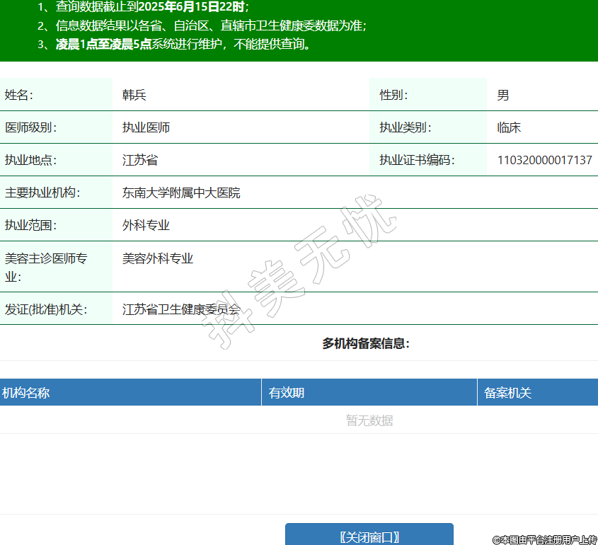 姓名:韓兵性別:男醫(yī)師級(jí)別:執(zhí)業(yè)醫(yī)師執(zhí)業(yè)類別:臨床執(zhí)業(yè)地點(diǎn):江蘇省執(zhí)業(yè)證書編碼:110320000017137主要執(zhí)業(yè)機(jī)構(gòu):東南大學(xué)附屬中大醫(yī)院執(zhí)業(yè)范圍:外科專業(yè)美容主診醫(yī)師專業(yè):美容外科專業(yè)發(fā)證(批準(zhǔn))機(jī)關(guān):江蘇省衛(wèi)生健康委員會(huì)