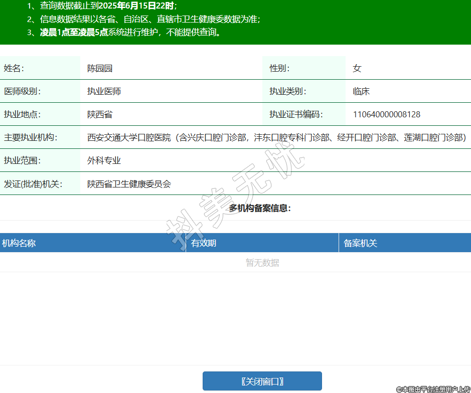 姓名:陳園園性別:女醫(yī)師級(jí)別:執(zhí)業(yè)醫(yī)師執(zhí)業(yè)類別:臨床執(zhí)業(yè)地點(diǎn):陜西省執(zhí)業(yè)證書編碼:110640000008128主要執(zhí)業(yè)機(jī)構(gòu):西安交通大學(xué)口腔醫(yī)院(含興慶口腔門診部,灃東口腔專科門診部、經(jīng)開口腔門診部、蓮湖口腔門診部)執(zhí)業(yè)范圍:外科專業(yè)發(fā)證(批準(zhǔn))機(jī)關(guān):陜西省衛(wèi)生健康委員會(huì)