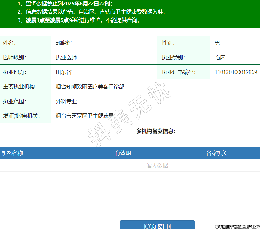 姓名:郭曉輝性別:男醫(yī)師級(jí)別:執(zhí)業(yè)醫(yī)師執(zhí)業(yè)類(lèi)別:臨床執(zhí)業(yè)地點(diǎn):山東省執(zhí)業(yè)證書(shū)編碼:110130100012869主要執(zhí)業(yè)機(jī)構(gòu):煙臺(tái)知顏致麗醫(yī)療美容門(mén)診部執(zhí)業(yè)范圍:外科專(zhuān)業(yè)發(fā)證(批準(zhǔn))機(jī)關(guān):煙臺(tái)市芝罘區(qū)衛(wèi)生健康局