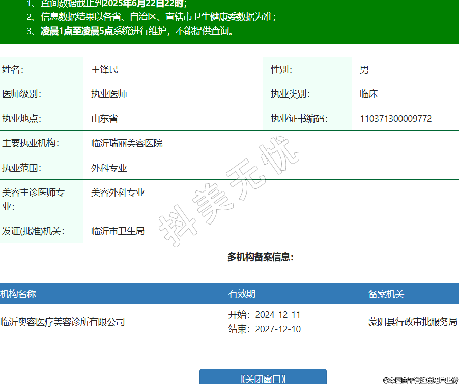 機(jī)構(gòu)名稱 有效期 備案機(jī)關(guān) 臨沂奧容醫(yī)療美容診所有限公司 開始:2024-12-11結(jié)束:2027-12-10蒙陰縣行政審批服務(wù)局 -