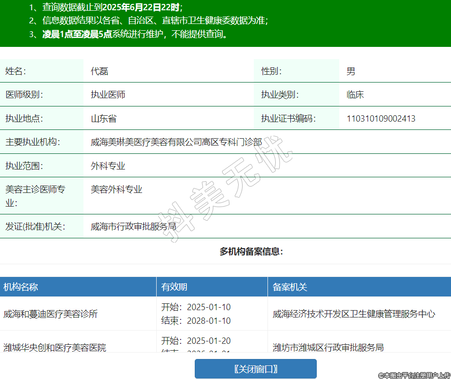 機構(gòu)名稱 有效期 備案機關(guān) 威海和蔓迪醫(yī)療美容診所 開始:2025-01-10結(jié)束:2028-01-10威海經(jīng)濟技術(shù)開發(fā)區(qū)衛(wèi)生健康管理服務(wù)中心 濰城華央創(chuàng)和醫(yī)療美容醫(yī)院 開始:2025-01-20結(jié)束:2026-01-01濰坊市濰城區(qū)行政審批服務(wù)局 威海仙美醫(yī)療美容診所 開始:2025-03-15結(jié)束:2028-03-15威?;鹁娓呒夹g(shù)產(chǎn)業(yè)開發(fā)區(qū)社會事業(yè)務(wù)局 -