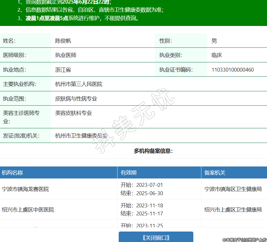 姓名:陳俊帆性別:男醫(yī)師級別:執(zhí)業(yè)醫(yī)師執(zhí)業(yè)類別:臨床執(zhí)業(yè)地點:浙江省執(zhí)業(yè)證書編碼:110330100000460主要執(zhí)業(yè)機構(gòu):杭州市第三人民醫(yī)院執(zhí)業(yè)范圍:皮膚病與性病專業(yè)美容主診醫(yī)師專業(yè):美容皮膚科專業(yè)發(fā)證(批準)機關(guān):杭州市衛(wèi)生健康委員會多機構(gòu)備案信息:
