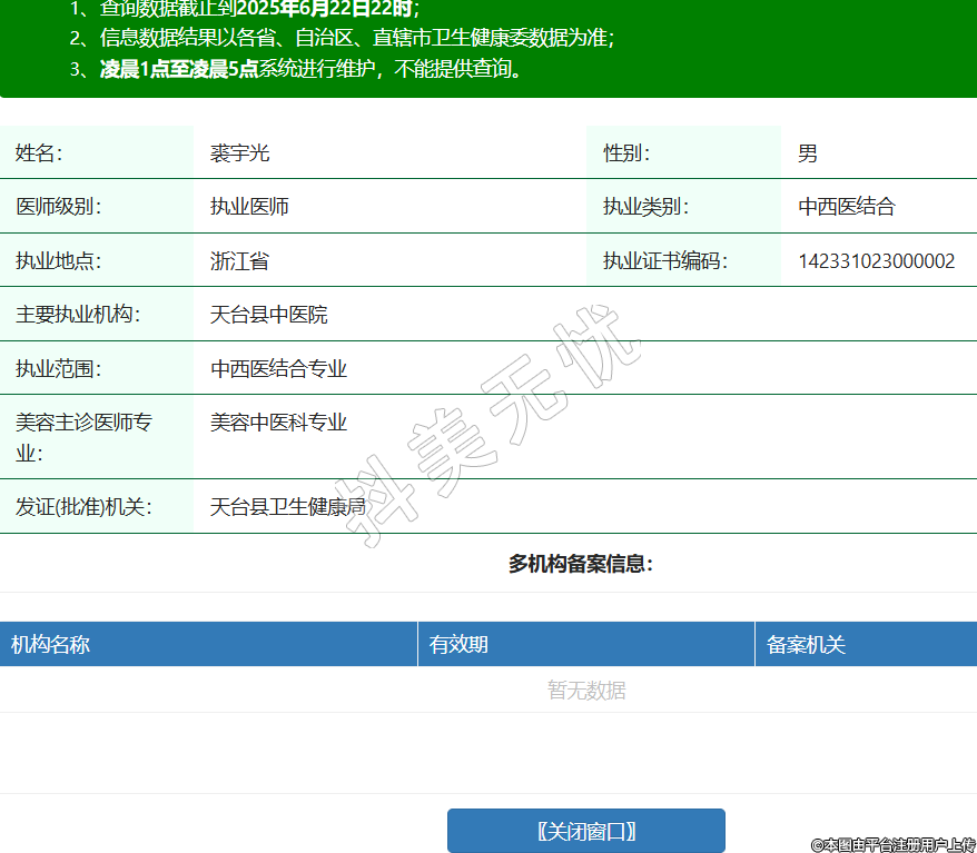姓名:裘宇光性別:男醫(yī)師級別:執(zhí)業(yè)醫(yī)師執(zhí)業(yè)類別:中西醫(yī)結(jié)合執(zhí)業(yè)地點:浙江省執(zhí)業(yè)證書編碼:142331023000002主要執(zhí)業(yè)機構(gòu):天臺縣中醫(yī)院執(zhí)業(yè)范圍:中西醫(yī)結(jié)合專業(yè)美容主診醫(yī)師專業(yè):美容中醫(yī)科專業(yè)發(fā)證(批準)機關(guān):天臺縣衛(wèi)生健康局