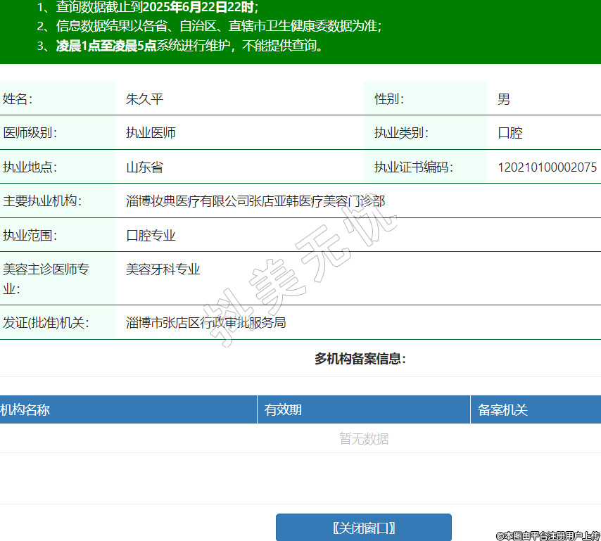 姓名:朱久平性別:男醫(yī)師級別:執(zhí)業(yè)醫(yī)師執(zhí)業(yè)類別:口腔執(zhí)業(yè)地點:山東省執(zhí)業(yè)證書編碼:120210100002075主要執(zhí)業(yè)機構:淄博妝典醫(yī)療有限公司張店亞韓醫(yī)療美容門診部執(zhí)業(yè)范圍:口腔專業(yè)美容主診醫(yī)師專業(yè):美容牙科專業(yè)發(fā)證(批準)機關:淄博市張店區(qū)行政審批服務局