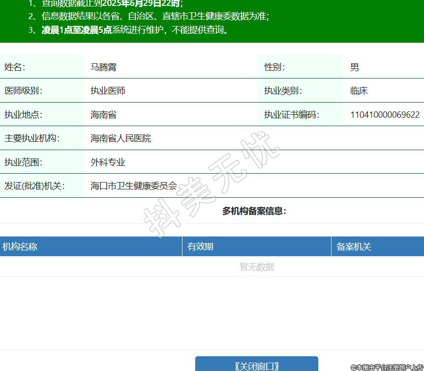 姓名:馬騰霄性別:男醫(yī)師級別:執(zhí)業(yè)醫(yī)師執(zhí)業(yè)類別:臨床執(zhí)業(yè)地點:海南省執(zhí)業(yè)證書編碼:110410000069622主要執(zhí)業(yè)機構(gòu):海南省人民醫(yī)院執(zhí)業(yè)范圍:外科專業(yè)發(fā)證(批準(zhǔn))機關(guān):??谑行l(wèi)生健康委員會