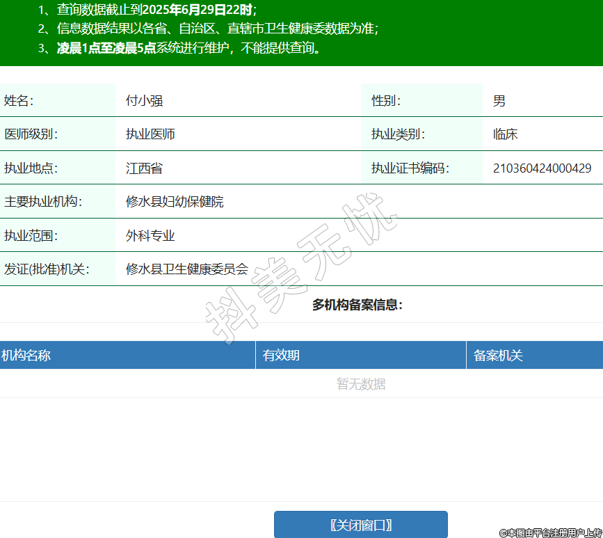 姓名:付小強(qiáng)性別:男醫(yī)師級(jí)別:執(zhí)業(yè)醫(yī)師執(zhí)業(yè)類別:臨床執(zhí)業(yè)地點(diǎn):江西省執(zhí)業(yè)證書編碼:210360424000429主要執(zhí)業(yè)機(jī)構(gòu):修水縣婦幼保健院執(zhí)業(yè)范圍:外科專業(yè)發(fā)證(批準(zhǔn))機(jī)關(guān):修水縣衛(wèi)生健康委員會(huì)