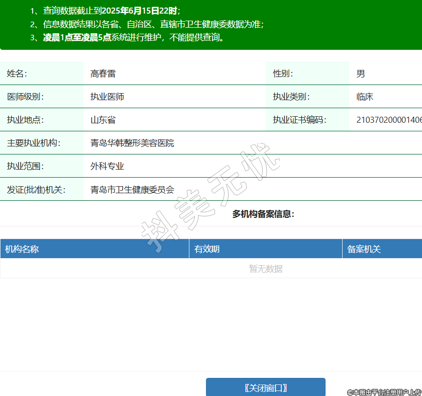姓名:高春雷性別:男醫(yī)師級(jí)別:執(zhí)業(yè)醫(yī)師執(zhí)業(yè)類別:臨床執(zhí)業(yè)地點(diǎn):山東省執(zhí)業(yè)證書編碼:210370200001406主要執(zhí)業(yè)機(jī)構(gòu):青島華韓整形美容醫(yī)院執(zhí)業(yè)范圍:外科專業(yè)發(fā)證(批準(zhǔn))機(jī)關(guān):青島市衛(wèi)生健康委員會(huì)