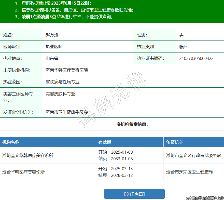 機(jī)構(gòu)名稱(chēng) 有效期 備案機(jī)關(guān) 濰坊奎文華韓醫(yī)療美容診所 開(kāi)始:2025-01-09結(jié)束:2033-01-08濰坊市奎文區(qū)行政審批服務(wù)局 煙臺(tái)華韓醫(yī)療美容診所 開(kāi)始:2025-03-13結(jié)束:2028-03-12煙臺(tái)市芝罘區(qū)衛(wèi)生健康局 -