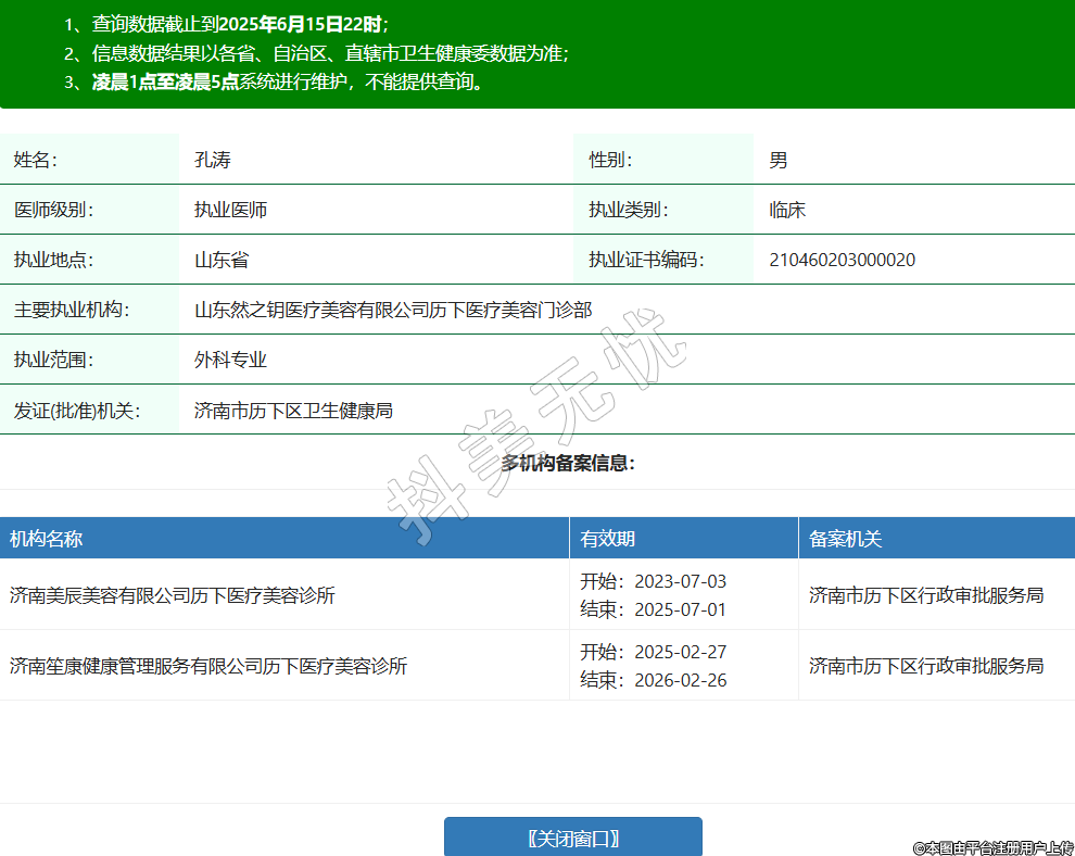 機構(gòu)名稱 有效期 備案機關(guān) 濟南美辰美容有限公司歷下醫(yī)療美容診所 開始:2023-07-03結(jié)束:2025-07-01濟南市歷下區(qū)行政審批服務(wù)局 濟南笙康健康管理服務(wù)有限公司歷下醫(yī)療美容診所 開始:2025-02-27結(jié)束:2026-02-26濟南市歷下區(qū)行政審批服務(wù)局 -