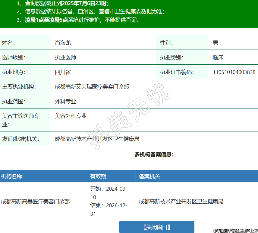 姓名:肖海龍性別:男醫(yī)師級(jí)別:執(zhí)業(yè)醫(yī)師執(zhí)業(yè)類別:臨床執(zhí)業(yè)地點(diǎn):四川省執(zhí)業(yè)證書編碼:110510104003838主要執(zhí)業(yè)機(jī)構(gòu):成都高新艾芙瑞醫(yī)療美容門診部執(zhí)業(yè)范圍:外科專業(yè)美容主診醫(yī)師專業(yè):美容外科專業(yè)發(fā)證(批準(zhǔn))機(jī)關(guān):成都高新技術(shù)產(chǎn)業(yè)開發(fā)區(qū)衛(wèi)生健康局多機(jī)構(gòu)備案信息: