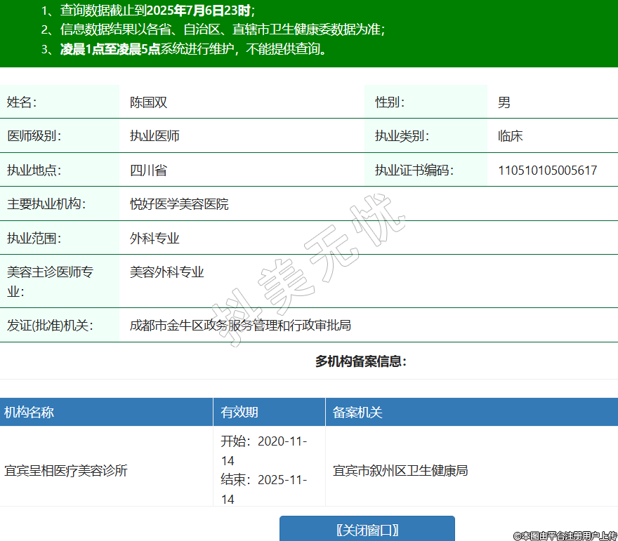 姓名:陳國雙性別:男醫(yī)師級別:執(zhí)業(yè)醫(yī)師執(zhí)業(yè)類別:臨床執(zhí)業(yè)地點:四川省執(zhí)業(yè)證書編碼:110510105005617主要執(zhí)業(yè)機構(gòu):悅好醫(yī)學(xué)美容醫(yī)院執(zhí)業(yè)范圍:外科專業(yè)美容主診醫(yī)師專業(yè):美容外科專業(yè)發(fā)證(批準(zhǔn))機關(guān):成都市金牛區(qū)政務(wù)服務(wù)管理和行政審批局多機構(gòu)備案信息: