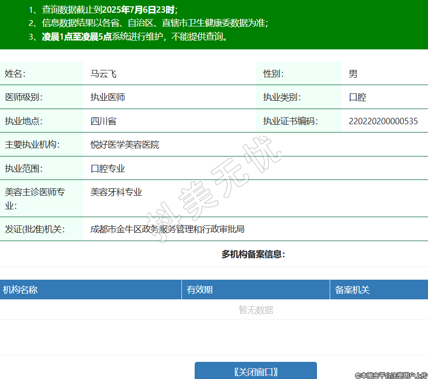 姓名:馬云飛性別:男醫(yī)師級別:執(zhí)業(yè)醫(yī)師執(zhí)業(yè)類別:口腔執(zhí)業(yè)地點(diǎn):四川省執(zhí)業(yè)證書編碼:220220200000535主要執(zhí)業(yè)機(jī)構(gòu):悅好醫(yī)學(xué)美容醫(yī)院執(zhí)業(yè)范圍:口腔專業(yè)美容主診醫(yī)師專業(yè):美容牙科專業(yè)發(fā)證(批準(zhǔn))機(jī)關(guān):成都市金牛區(qū)政務(wù)服務(wù)管理和行政審批局