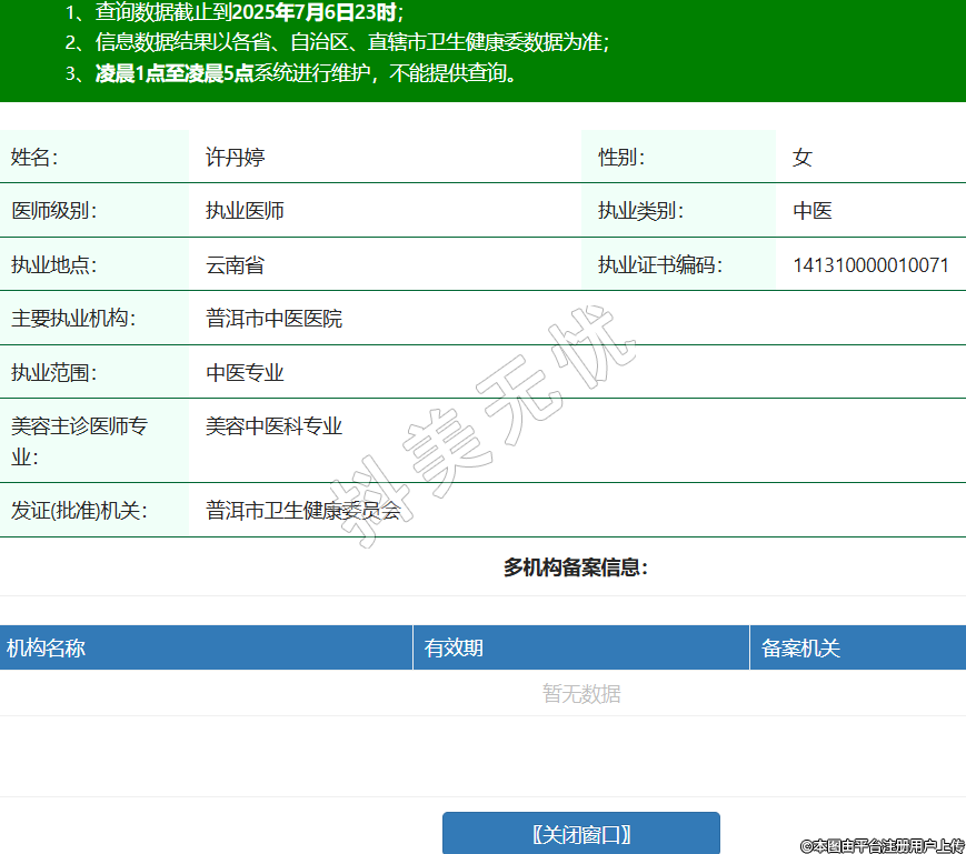 姓名:許丹婷性別:女醫(yī)師級別:執(zhí)業(yè)醫(yī)師執(zhí)業(yè)類別:中醫(yī)執(zhí)業(yè)地點:云南省執(zhí)業(yè)證書編碼:141310000010071主要執(zhí)業(yè)機構(gòu):普洱市中醫(yī)醫(yī)院執(zhí)業(yè)范圍:中醫(yī)專業(yè)美容主診醫(yī)師專業(yè):美容中醫(yī)科專業(yè)發(fā)證(批準)機關(guān):普洱市衛(wèi)生健康委員會