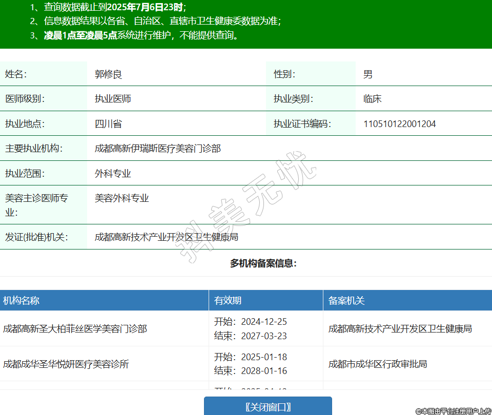 機構名稱 有效期 備案機關 成都高新圣大柏菲絲醫(yī)學美容門診部 開始:2024-12-25結束:2027-03-23成都高新技術產(chǎn)業(yè)開發(fā)區(qū)衛(wèi)生健康局 成都成華圣華悅妍醫(yī)療美容診所 開始:2025-01-18結束:2028-01-16成都市成華區(qū)行政審批局 蜜拉心顏醫(yī)療美容診所 開始:2025-04-12結束:2027-03-11達州市通川區(qū)衛(wèi)生健康局 -