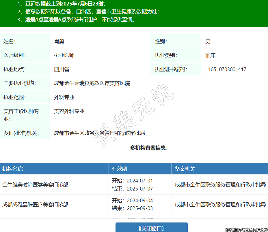 機(jī)構(gòu)名稱 有效期 備案機(jī)關(guān) 金牛維美時尚醫(yī)學(xué)美容門診部 開始:2024-07-01結(jié)束:2025-07-07成都市金牛區(qū)政務(wù)服務(wù)管理和行政審批局 成都成雅晶膚醫(yī)療美容門診部 開始:2024-09-04結(jié)束:2025-09-03成都市金牛區(qū)政務(wù)服務(wù)管理和行政審批局 成都成華圣華悅妍醫(yī)療美容診所 開始:2024-12-07結(jié)束:2026-12-06成都市成華區(qū)行政審批局 成都高新伊瑞斯醫(yī)療美容門診部 開始:2025-01-23結(jié)束:2027-01-22成都高新技術(shù)產(chǎn)業(yè)開發(fā)區(qū)衛(wèi)生健康局 成都天府新區(qū)美悅醫(yī)療美容門診部 開始:2025-04-17結(jié)束:2025-09-16四川天府新區(qū)智慧城市運行局 -