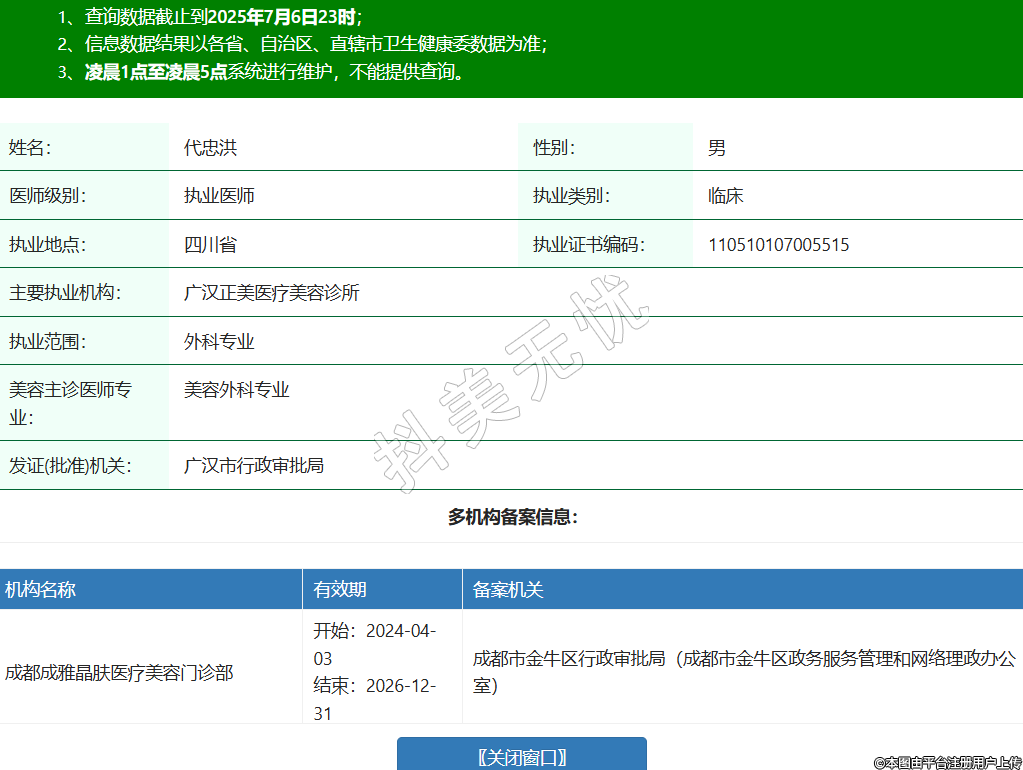 機構(gòu)名稱 有效期 備案機關(guān) 成都成雅晶膚醫(yī)療美容門診部 開始:2024-04-03結(jié)束:2026-12-31成都市金牛區(qū)行政審批局(成都市金牛區(qū)政務服務管理和網(wǎng)絡(luò)理政辦公室) 成都高新中美瑞辰綜合門診部 開始:2024-04-04結(jié)束:2026-12-31成都高新技術(shù)產(chǎn)業(yè)開發(fā)區(qū)衛(wèi)生健康局 成都青羊侑姿醫(yī)療美容門診部 開始:2024-04-09結(jié)束:2026-12-08成都市青羊區(qū)行政審批局(成都市青羊區(qū)政務服務管理和網(wǎng)絡(luò)理政辦公室) 華人醫(yī)聯(lián)整形美容醫(yī)院 開始:2024-04-15結(jié)束:2026-12-31成都市青羊區(qū)行政審批局(成都市青羊區(qū)政務服務管理和網(wǎng)絡(luò)理政辦公室) 成都高新熙之環(huán)亞醫(yī)療美容醫(yī)院 開始:2024-04-24結(jié)束:2026-12-31成都高新技術(shù)產(chǎn)業(yè)開發(fā)區(qū)衛(wèi)生健康局 成都武侯華生鉑悅美容醫(yī)院 開始:2024-05-15結(jié)束:2028-12-31成都市武侯區(qū)行政審批局 成都青羊華人醫(yī)聯(lián)為美醫(yī)療美容門診部 開始:2024-07-06結(jié)束:2027-12-31成都市青羊區(qū)行政審批局(成都市青羊區(qū)政務服務管理和網(wǎng)絡(luò)理政辦公室) 成都武侯圣形醫(yī)療美容門診部 開始:2024-08-21結(jié)束:2026-12-31成都市武侯區(qū)行政審批局 成都高新科賦麗爾醫(yī)療美容診所 開始:2024-10-22結(jié)束:2026-10-31成都高新技術(shù)產(chǎn)業(yè)開發(fā)區(qū)衛(wèi)生健康局 -