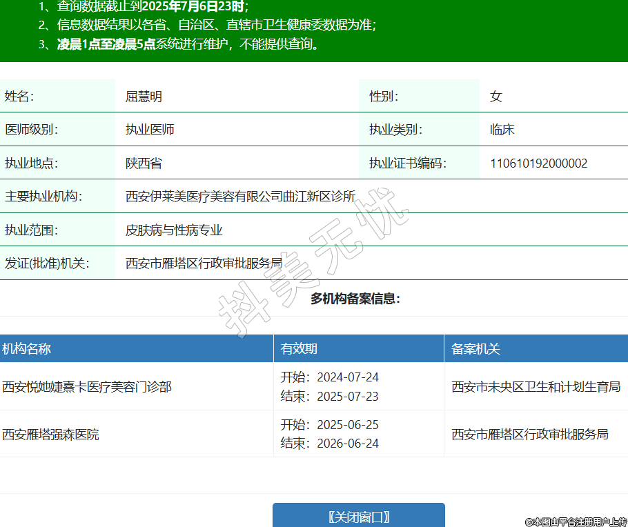 機(jī)構(gòu)名稱 有效期 備案機(jī)關(guān) 西安悅她婕熹卡醫(yī)療美容門診部 開始:2024-07-24結(jié)束:2025-07-23西安市未央?yún)^(qū)衛(wèi)生和計(jì)劃生育局 西安雁塔強(qiáng)森醫(yī)院 開始:2025-06-25結(jié)束:2026-06-24西安市雁塔區(qū)行政審批服務(wù)局 -