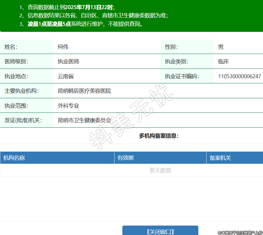 姓名:何偉性別:男醫(yī)師級別:執(zhí)業(yè)醫(yī)師執(zhí)業(yè)類別:臨床執(zhí)業(yè)地點:云南省執(zhí)業(yè)證書編碼:110530000006247主要執(zhí)業(yè)機構(gòu):昆明韓辰醫(yī)療美容醫(yī)院執(zhí)業(yè)范圍:外科專業(yè)發(fā)證(批準)機關(guān):昆明市衛(wèi)生健康委員會