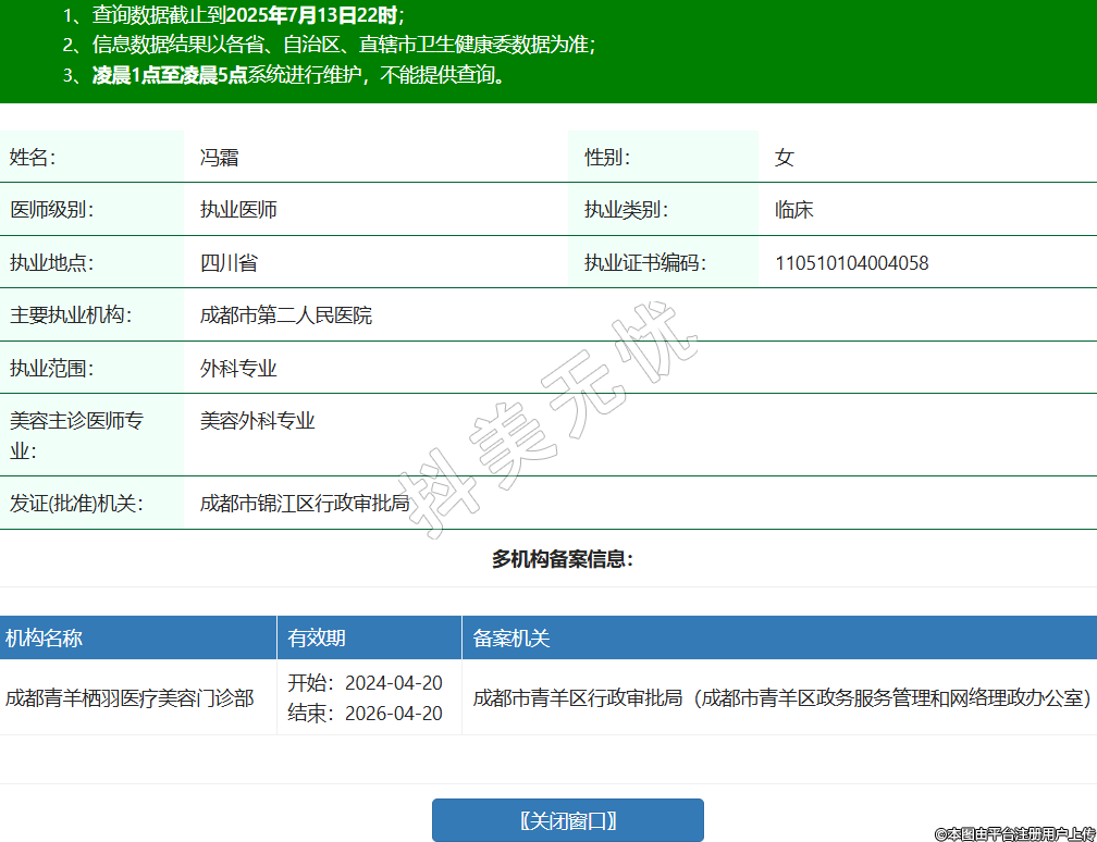 姓名:馮霜性別:女醫(yī)師級別:執(zhí)業(yè)醫(yī)師執(zhí)業(yè)類別:臨床執(zhí)業(yè)地點:四川省執(zhí)業(yè)證書編碼:110510104004058主要執(zhí)業(yè)機構:成都市第二人民醫(yī)院執(zhí)業(yè)范圍:外科專業(yè)美容主診醫(yī)師專業(yè):美容外科專業(yè)發(fā)證(批準)機關:成都市錦江區(qū)行政審批局多機構備案信息: