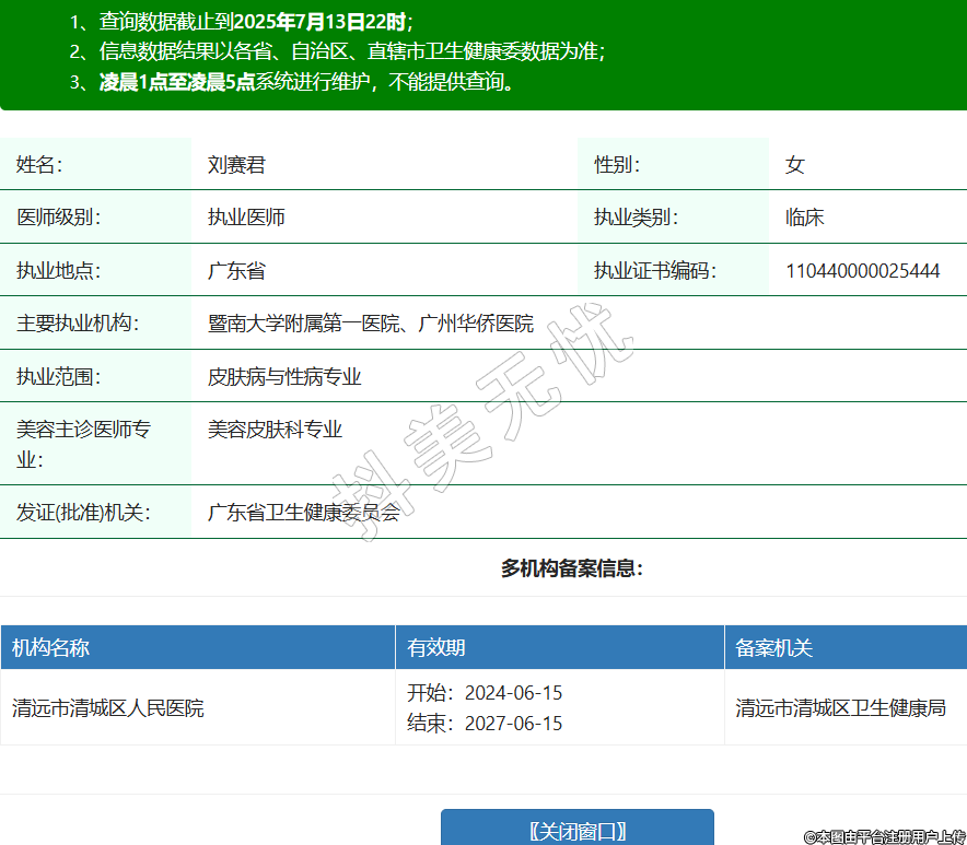 姓名:劉賽君性別:女醫(yī)師級別:執(zhí)業(yè)醫(yī)師執(zhí)業(yè)類別:臨床執(zhí)業(yè)地點:廣東省執(zhí)業(yè)證書編碼:110440000025444主要執(zhí)業(yè)機構(gòu):暨南大學(xué)附屬第一醫(yī)院、廣州華僑醫(yī)院執(zhí)業(yè)范圍:皮膚病與性病專業(yè)美容主診醫(yī)師專業(yè):美容皮膚科專業(yè)發(fā)證(批準(zhǔn))機關(guān):廣東省衛(wèi)生健康委員會多機構(gòu)備案信息: