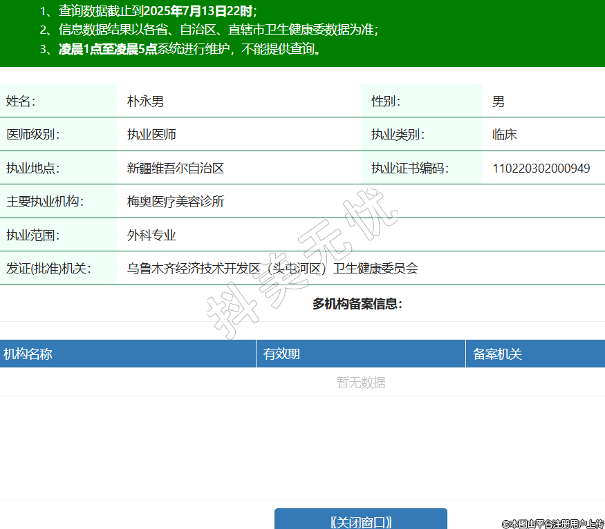 姓名:樸永男性別:男醫(yī)師級別:執(zhí)業(yè)醫(yī)師執(zhí)業(yè)類別:臨床執(zhí)業(yè)地點:新疆維吾爾自治區(qū)執(zhí)業(yè)證書編碼:110220302000949主要執(zhí)業(yè)機構:梅奧醫(yī)療美容診所執(zhí)業(yè)范圍:外科專業(yè)發(fā)證(批準)機關:烏魯木齊經濟技術開發(fā)區(qū)(頭屯河區(qū))衛(wèi)生健康委員會