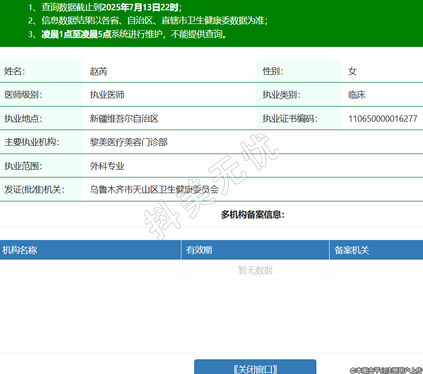 姓名:趙芮性別:女醫(yī)師級別:執(zhí)業(yè)醫(yī)師執(zhí)業(yè)類別:臨床執(zhí)業(yè)地點(diǎn):新疆維吾爾自治區(qū)執(zhí)業(yè)證書編碼:110650000016277主要執(zhí)業(yè)機(jī)構(gòu):黎美醫(yī)療美容門診部執(zhí)業(yè)范圍:外科專業(yè)發(fā)證(批準(zhǔn))機(jī)關(guān):烏魯木齊市天山區(qū)衛(wèi)生健康委員會