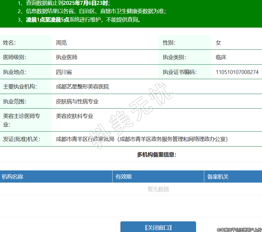 姓名:周覓性別:女醫(yī)師級(jí)別:執(zhí)業(yè)醫(yī)師執(zhí)業(yè)類別:臨床執(zhí)業(yè)地點(diǎn):四川省執(zhí)業(yè)證書編碼:110510107008274主要執(zhí)業(yè)機(jī)構(gòu):成都藝星整形美容醫(yī)院執(zhí)業(yè)范圍:皮膚病與性病專業(yè)美容主診醫(yī)師專業(yè):美容皮膚科專業(yè)發(fā)證(批準(zhǔn))機(jī)關(guān):成都市青羊區(qū)行政審批局(成都市青羊區(qū)政務(wù)服務(wù)管理和網(wǎng)絡(luò)理政辦公室)
