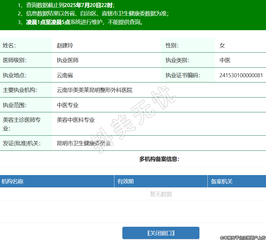 姓名:趙建玲性別:女醫(yī)師級(jí)別:執(zhí)業(yè)醫(yī)師執(zhí)業(yè)類(lèi)別:中醫(yī)執(zhí)業(yè)地點(diǎn):云南省執(zhí)業(yè)證書(shū)編碼:241530100000081主要執(zhí)業(yè)機(jī)構(gòu):云南華美美萊昆明整形外科醫(yī)院執(zhí)業(yè)范圍:中醫(yī)專業(yè)美容主診醫(yī)師專業(yè):美容中醫(yī)科專業(yè)發(fā)證(批準(zhǔn))機(jī)關(guān):昆明市衛(wèi)生健康委員會(huì)