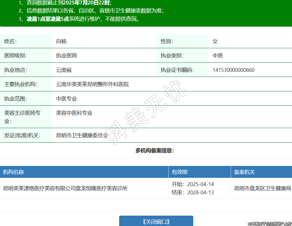 機構(gòu)名稱 有效期 備案機關(guān) 昆明美萊漾格醫(yī)療美容有限公司盤龍恒隆醫(yī)療美容診所 開始:2025-04-14結(jié)束:2028-04-13昆明市盤龍區(qū)衛(wèi)生健康局 -