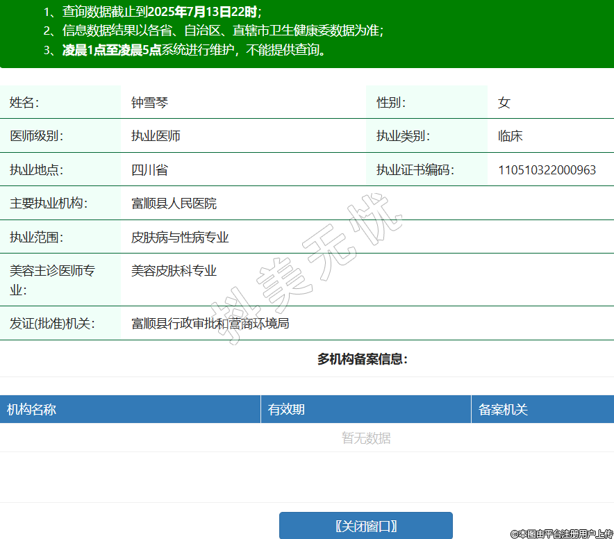 姓名:鐘雪琴性別:女醫(yī)師級別:執(zhí)業(yè)醫(yī)師執(zhí)業(yè)類別:臨床執(zhí)業(yè)地點:四川省執(zhí)業(yè)證書編碼:110510322000963主要執(zhí)業(yè)機構:富順縣人民醫(yī)院執(zhí)業(yè)范圍:皮膚病與性病專業(yè)美容主診醫(yī)師專業(yè):美容皮膚科專業(yè)發(fā)證(批準)機關:富順縣行政審批和營商環(huán)境局