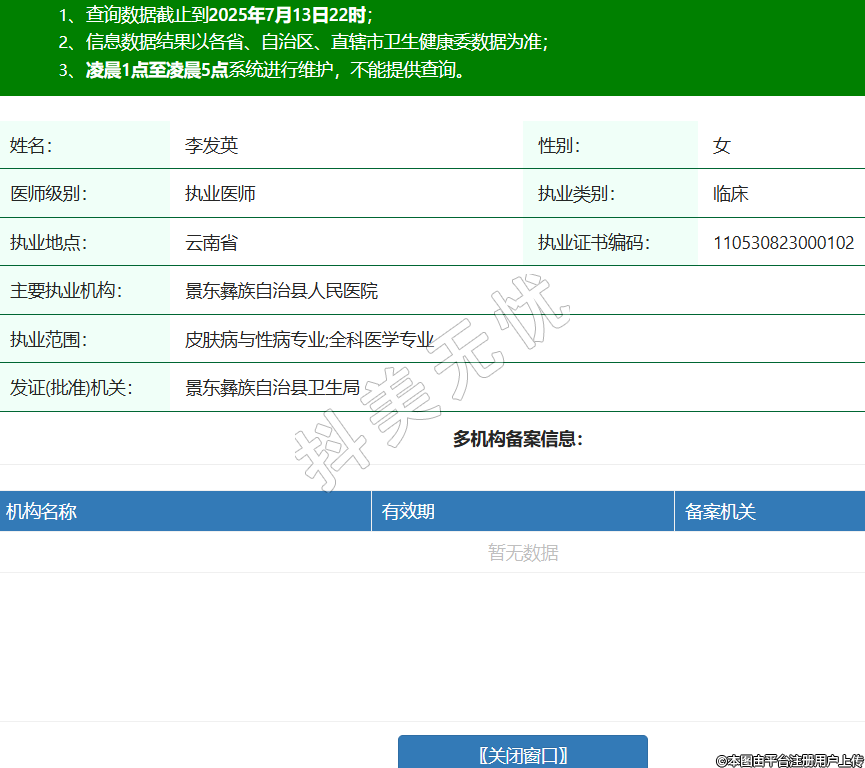姓名:李發(fā)英性別:女醫(yī)師級別:執(zhí)業(yè)醫(yī)師執(zhí)業(yè)類別:臨床執(zhí)業(yè)地點(diǎn):云南省執(zhí)業(yè)證書編碼:110530823000102主要執(zhí)業(yè)機(jī)構(gòu):景東彝族自治縣人民醫(yī)院執(zhí)業(yè)范圍:皮膚病與性病專業(yè);全科醫(yī)學(xué)專業(yè)發(fā)證(批準(zhǔn))機(jī)關(guān):景東彝族自治縣衛(wèi)生局