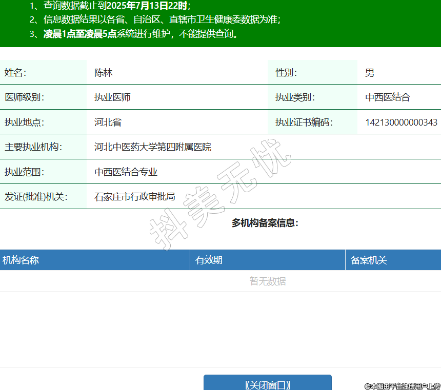 姓名:陳林性別:男醫(yī)師級(jí)別:執(zhí)業(yè)醫(yī)師執(zhí)業(yè)類別:中西醫(yī)結(jié)合執(zhí)業(yè)地點(diǎn):河北省執(zhí)業(yè)證書編碼:142130000000343主要執(zhí)業(yè)機(jī)構(gòu):河北中醫(yī)藥大學(xué)第四附屬醫(yī)院執(zhí)業(yè)范圍:中西醫(yī)結(jié)合專業(yè)發(fā)證(批準(zhǔn))機(jī)關(guān):石家莊市行政審批局
