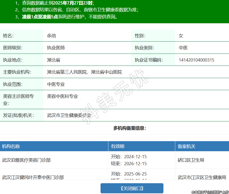 機(jī)構(gòu)名稱 有效期 備案機(jī)關(guān) 武漢泊雅醫(yī)療美容門診部 開(kāi)始:2024-12-15結(jié)束:2026-12-15硚口區(qū)衛(wèi)生局 武漢江漢健民葉開(kāi)泰中醫(yī)門診部 開(kāi)始:2025-06-25結(jié)束:2030-06-24武漢市江漢區(qū)衛(wèi)生健康局 -