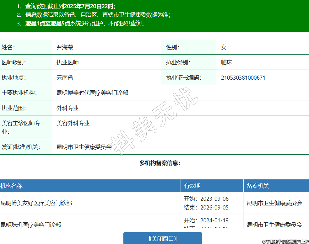機構名稱 有效期 備案機關 昆明博美友好醫(yī)療美容門診部 開始:2023-09-06結束:2026-09-05昆明市衛(wèi)生健康委員會 昆明珠璣醫(yī)療美容門診部 開始:2024-01-19結束:2025-12-18昆明市衛(wèi)生健康委員會 云南比爾西希生物科技有限公司盤龍麗水雅苑醫(yī)療美容診所 開始:2024-06-14結束:2027-06-14昆明市盤龍區(qū)衛(wèi)生健康局 紅河博美醫(yī)療美容門診部 開始:2025-05-15結束:2026-05-14蒙自市衛(wèi)生健康局 -