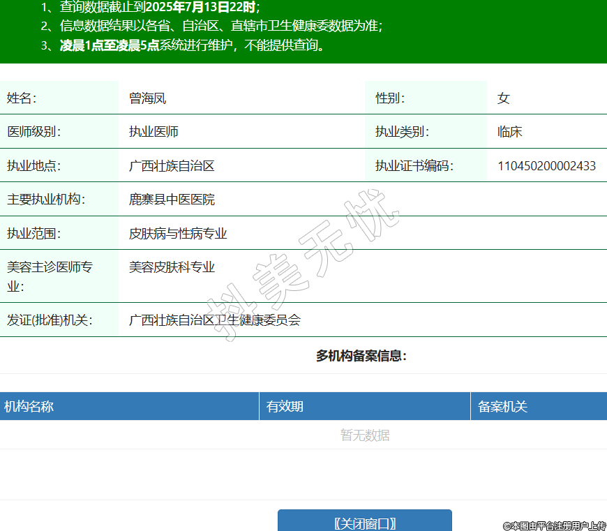 姓名:曾海鳳性別:女醫(yī)師級別:執(zhí)業(yè)醫(yī)師執(zhí)業(yè)類別:臨床執(zhí)業(yè)地點:廣西壯族自治區(qū)執(zhí)業(yè)證書編碼:110450200002433主要執(zhí)業(yè)機構:鹿寨縣中醫(yī)醫(yī)院執(zhí)業(yè)范圍:皮膚病與性病專業(yè)美容主診醫(yī)師專業(yè):美容皮膚科專業(yè)發(fā)證(批準)機關:廣西壯族自治區(qū)衛(wèi)生健康委員會