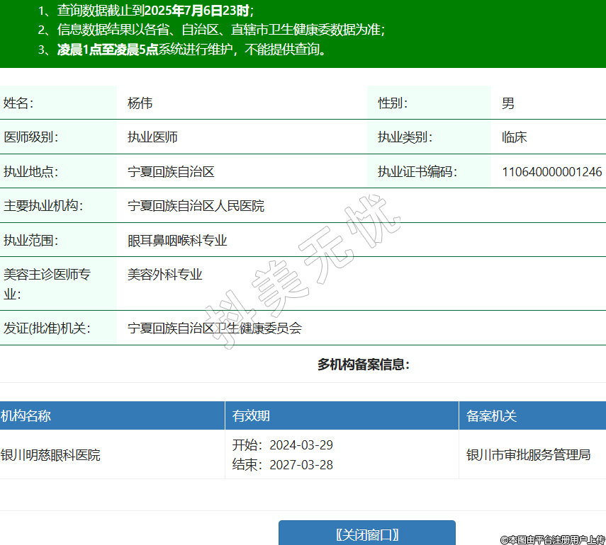 姓名:楊偉性別:男醫(yī)師級別:執(zhí)業(yè)醫(yī)師執(zhí)業(yè)類別:臨床執(zhí)業(yè)地點:寧夏回族自治區(qū)執(zhí)業(yè)證書編碼:110640000001246主要執(zhí)業(yè)機構(gòu):寧夏回族自治區(qū)人民醫(yī)院執(zhí)業(yè)范圍:眼耳鼻咽喉科專業(yè)美容主診醫(yī)師專業(yè):美容外科專業(yè)發(fā)證(批準(zhǔn))機關(guān):寧夏回族自治區(qū)衛(wèi)生健康委員會多機構(gòu)備案信息: