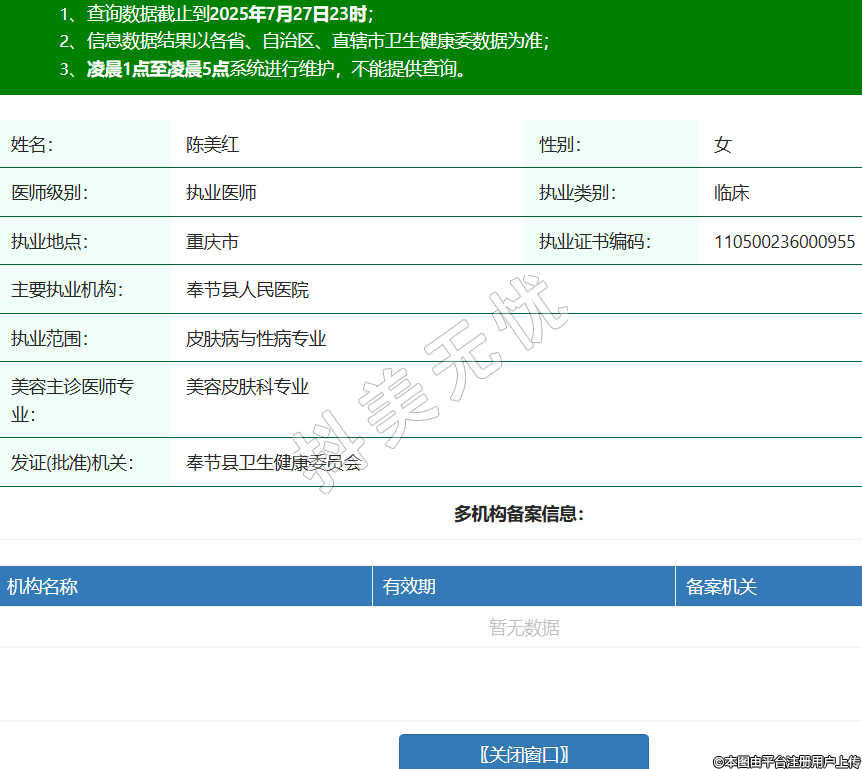 姓名:陳美紅性別:女醫(yī)師級(jí)別:執(zhí)業(yè)醫(yī)師執(zhí)業(yè)類別:臨床執(zhí)業(yè)地點(diǎn):重慶市執(zhí)業(yè)證書編碼:110500236000955主要執(zhí)業(yè)機(jī)構(gòu):奉節(jié)縣人民醫(yī)院執(zhí)業(yè)范圍:皮膚病與性病專業(yè)美容主診醫(yī)師專業(yè):美容皮膚科專業(yè)發(fā)證(批準(zhǔn))機(jī)關(guān):奉節(jié)縣衛(wèi)生健康委員會(huì)