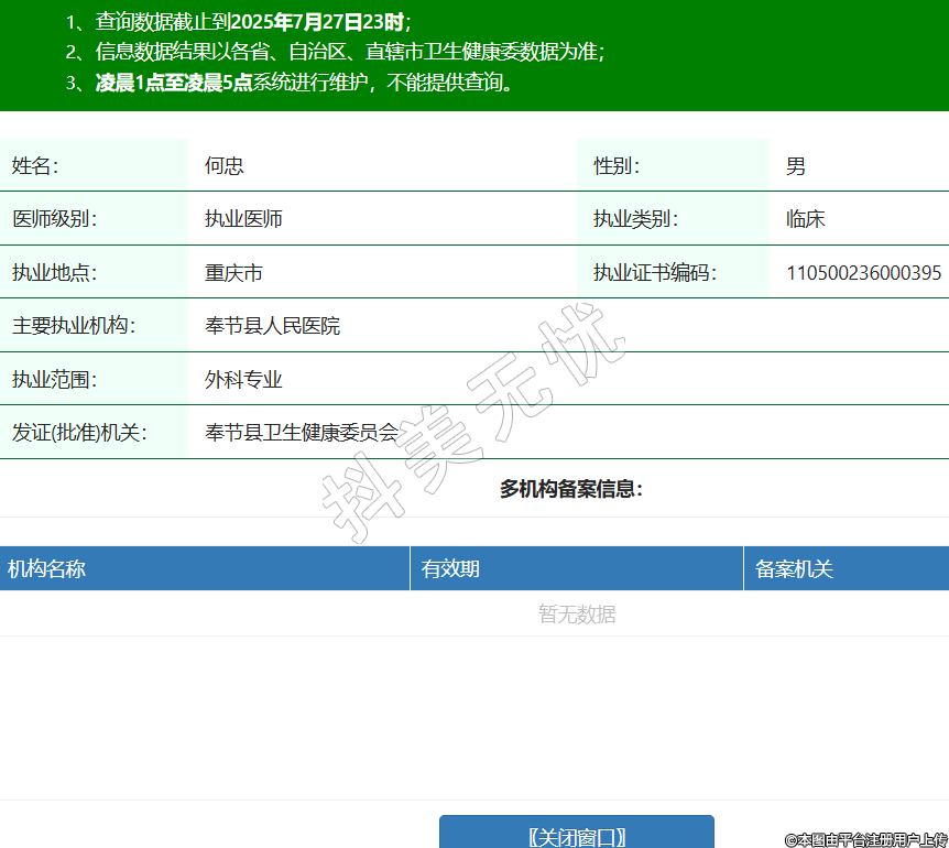 姓名:何忠性別:男醫(yī)師級別:執(zhí)業(yè)醫(yī)師執(zhí)業(yè)類別:臨床執(zhí)業(yè)地點:重慶市執(zhí)業(yè)證書編碼:110500236000395主要執(zhí)業(yè)機構:奉節(jié)縣人民醫(yī)院執(zhí)業(yè)范圍:外科專業(yè)發(fā)證(批準)機關:奉節(jié)縣衛(wèi)生健康委員會