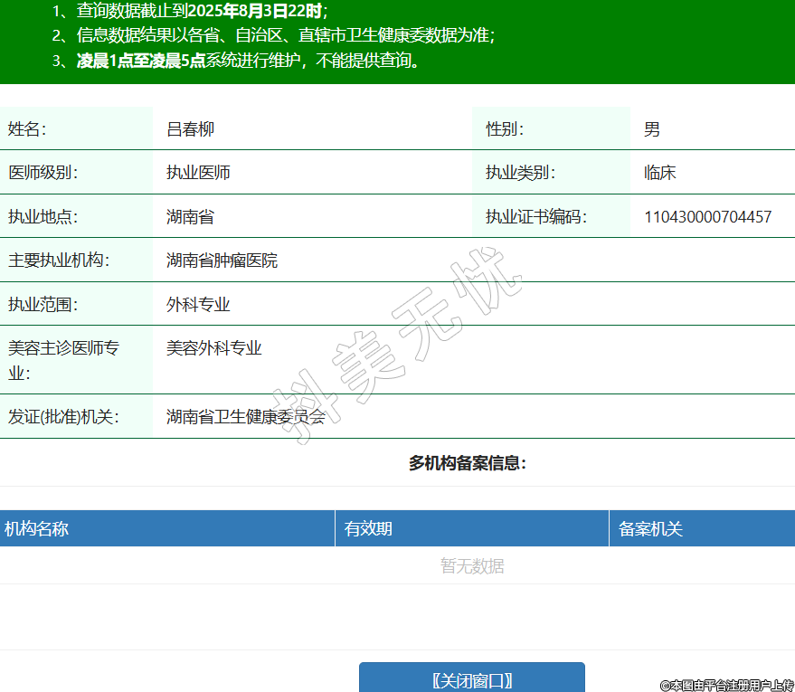 姓名:呂春柳性別:男醫(yī)師級別:執(zhí)業(yè)醫(yī)師執(zhí)業(yè)類別:臨床執(zhí)業(yè)地點:湖南省執(zhí)業(yè)證書編碼:110430000704457主要執(zhí)業(yè)機構(gòu):湖南省腫瘤醫(yī)院執(zhí)業(yè)范圍:外科專業(yè)美容主診醫(yī)師專業(yè):美容外科專業(yè)發(fā)證(批準(zhǔn))機關(guān):湖南省衛(wèi)生健康委員會