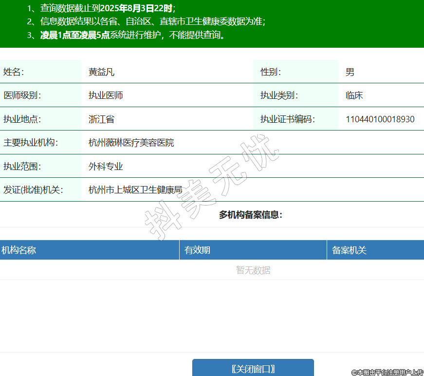 姓名:黃益凡性別:男醫(yī)師級別:執(zhí)業(yè)醫(yī)師執(zhí)業(yè)類別:臨床執(zhí)業(yè)地點:浙江省執(zhí)業(yè)證書編碼:110440100018930主要執(zhí)業(yè)機構(gòu):杭州薇琳醫(yī)療美容醫(yī)院執(zhí)業(yè)范圍:外科專業(yè)發(fā)證(批準(zhǔn))機關(guān):杭州市上城區(qū)衛(wèi)生健康局