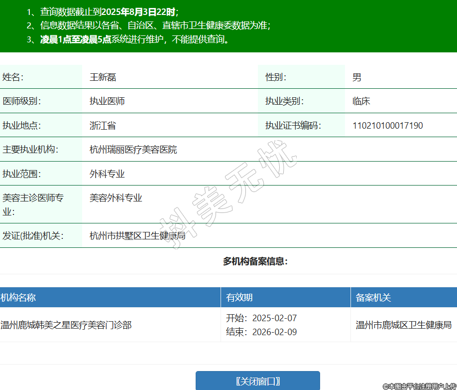 姓名:王新磊性別:男醫(yī)師級別:執(zhí)業(yè)醫(yī)師執(zhí)業(yè)類別:臨床執(zhí)業(yè)地點:浙江省執(zhí)業(yè)證書編碼:110210100017190主要執(zhí)業(yè)機構(gòu):杭州瑞麗醫(yī)療美容醫(yī)院執(zhí)業(yè)范圍:外科專業(yè)美容主診醫(yī)師專業(yè):美容外科專業(yè)發(fā)證(批準(zhǔn))機關(guān):杭州市拱墅區(qū)衛(wèi)生健康局多機構(gòu)備案信息: