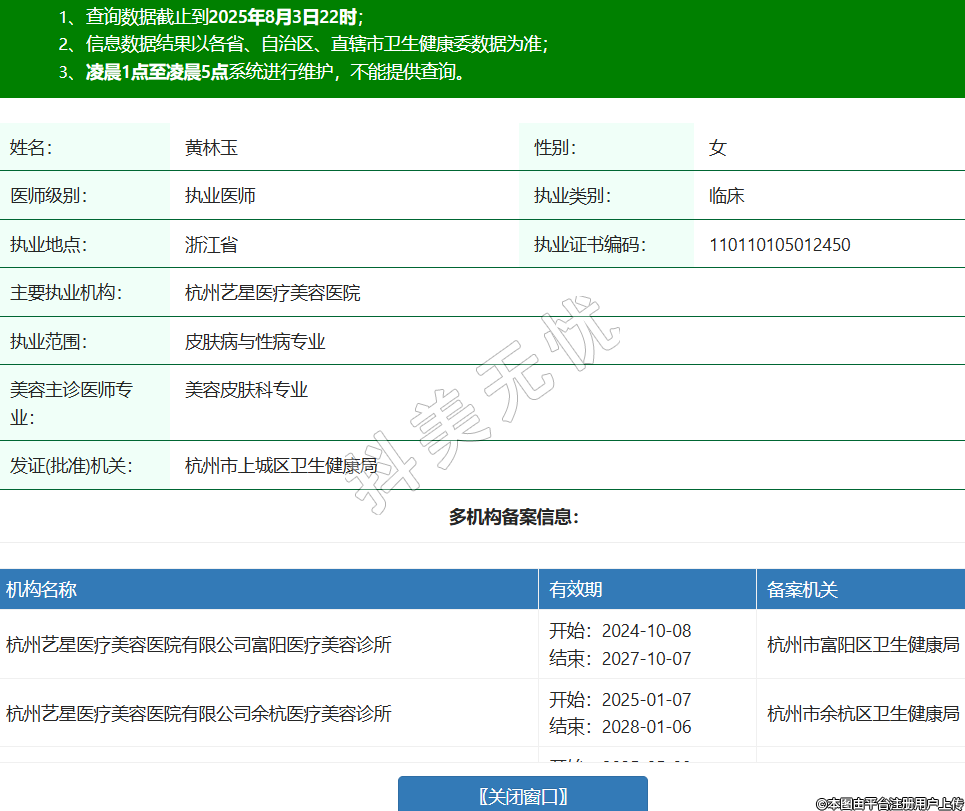 機(jī)構(gòu)名稱 有效期 備案機(jī)關(guān) 杭州藝星醫(yī)療美容醫(yī)院有限公司富陽醫(yī)療美容診所 開始:2024-10-08結(jié)束:2027-10-07杭州市富陽區(qū)衛(wèi)生健康局 杭州藝星醫(yī)療美容醫(yī)院有限公司余杭醫(yī)療美容診所 開始:2025-01-07結(jié)束:2028-01-06杭州市余杭區(qū)衛(wèi)生健康局 杭州藝星醫(yī)療美容醫(yī)院有限公司城北醫(yī)療美容診所 開始:2025-05-08結(jié)束:2028-05-07杭州市拱墅區(qū)衛(wèi)生健康局 杭州藝星醫(yī)療美容醫(yī)院有限公司城東醫(yī)療美容診所 開始:2025-07-24結(jié)束:2028-07-23杭州市上城區(qū)衛(wèi)生健康局 -