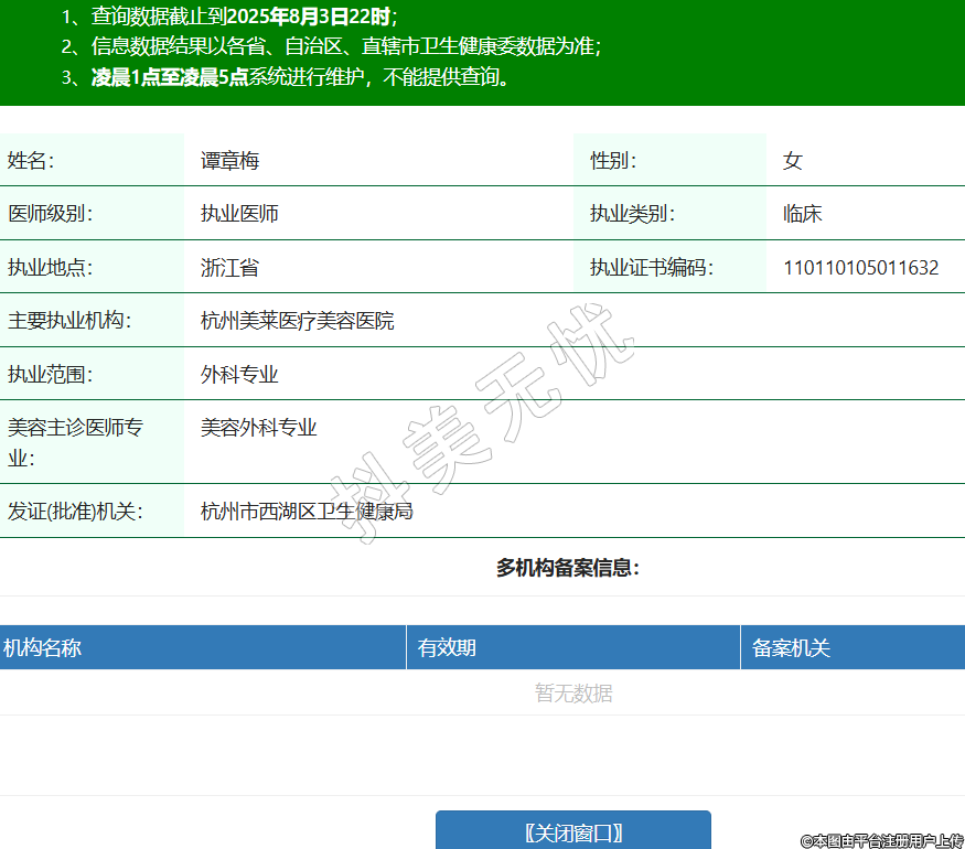 姓名:譚章梅性別:女醫(yī)師級別:執(zhí)業(yè)醫(yī)師執(zhí)業(yè)類別:臨床執(zhí)業(yè)地點(diǎn):浙江省執(zhí)業(yè)證書編碼:110110105011632主要執(zhí)業(yè)機(jī)構(gòu):杭州美萊醫(yī)療美容醫(yī)院執(zhí)業(yè)范圍:外科專業(yè)美容主診醫(yī)師專業(yè):美容外科專業(yè)發(fā)證(批準(zhǔn))機(jī)關(guān):杭州市西湖區(qū)衛(wèi)生健康局
