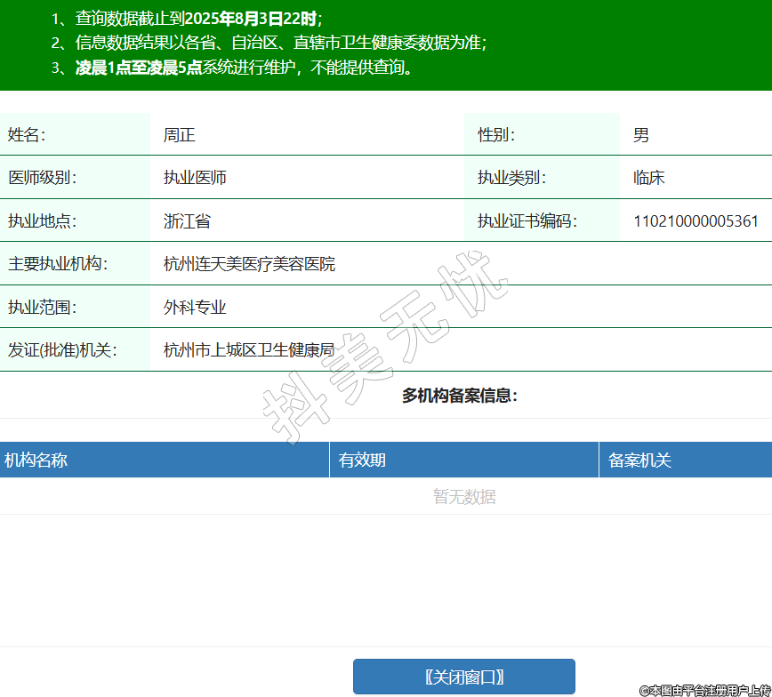 姓名:周正性別:男醫(yī)師級(jí)別:執(zhí)業(yè)醫(yī)師執(zhí)業(yè)類(lèi)別:臨床執(zhí)業(yè)地點(diǎn):浙江省執(zhí)業(yè)證書(shū)編碼:110210000005361主要執(zhí)業(yè)機(jī)構(gòu):杭州連天美醫(yī)療美容醫(yī)院執(zhí)業(yè)范圍:外科專(zhuān)業(yè)發(fā)證(批準(zhǔn))機(jī)關(guān):杭州市上城區(qū)衛(wèi)生健康局