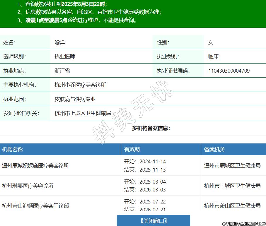 機(jī)構(gòu)名稱(chēng) 有效期 備案機(jī)關(guān) 溫州鹿城妃妮施醫(yī)療美容診所 開(kāi)始:2024-11-14結(jié)束:2025-11-13溫州市鹿城區(qū)衛(wèi)生健康局 杭州琳娜醫(yī)療美容診所 開(kāi)始:2025-03-04結(jié)束:2026-03-03杭州市上城區(qū)衛(wèi)生健康局 杭州蕭山滬顏醫(yī)療美容門(mén)診部 開(kāi)始:2025-07-22結(jié)束:2026-07-21杭州市蕭山區(qū)衛(wèi)生健康局 -