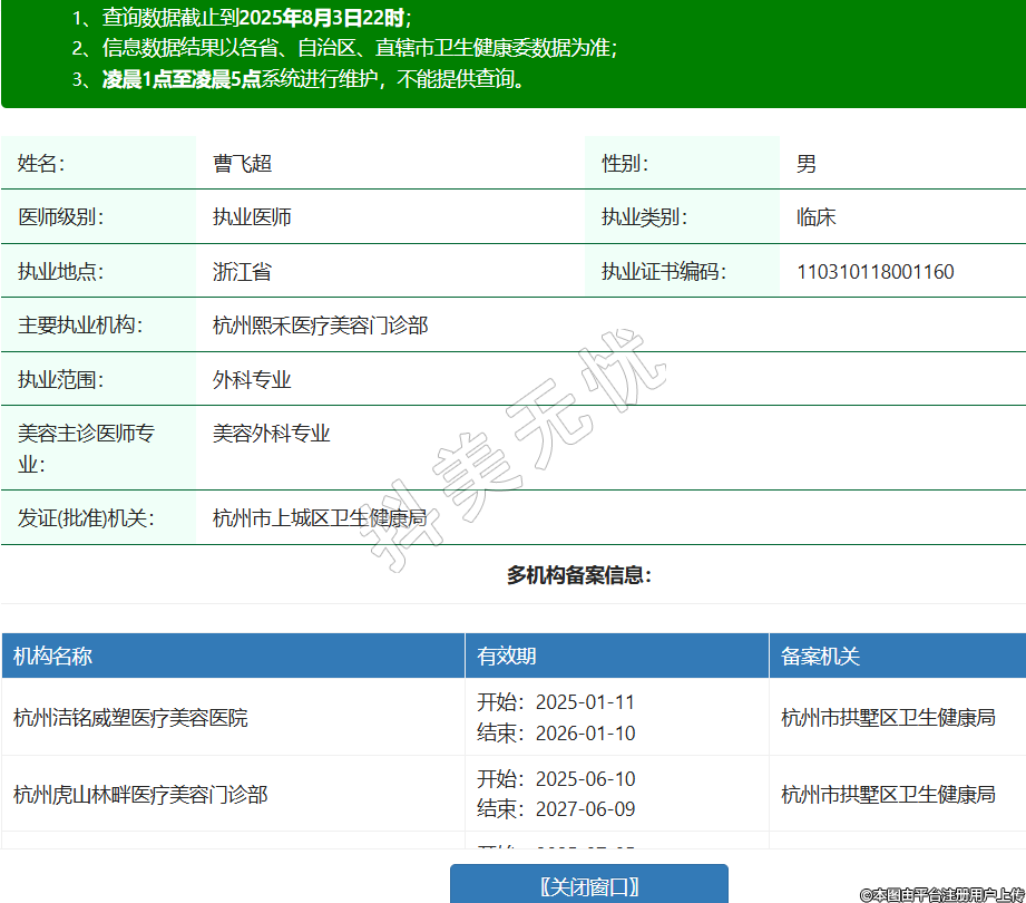 機(jī)構(gòu)名稱 有效期 備案機(jī)關(guān) 杭州潔銘威塑醫(yī)療美容醫(yī)院 開始:2025-01-11結(jié)束:2026-01-10杭州市拱墅區(qū)衛(wèi)生健康局 杭州虎山林畔醫(yī)療美容門診部 開始:2025-06-10結(jié)束:2027-06-09杭州市拱墅區(qū)衛(wèi)生健康局 杭州熙柚醫(yī)療美容門診部 開始:2025-07-05結(jié)束:2028-07-04杭州市上城區(qū)衛(wèi)生健康局 -